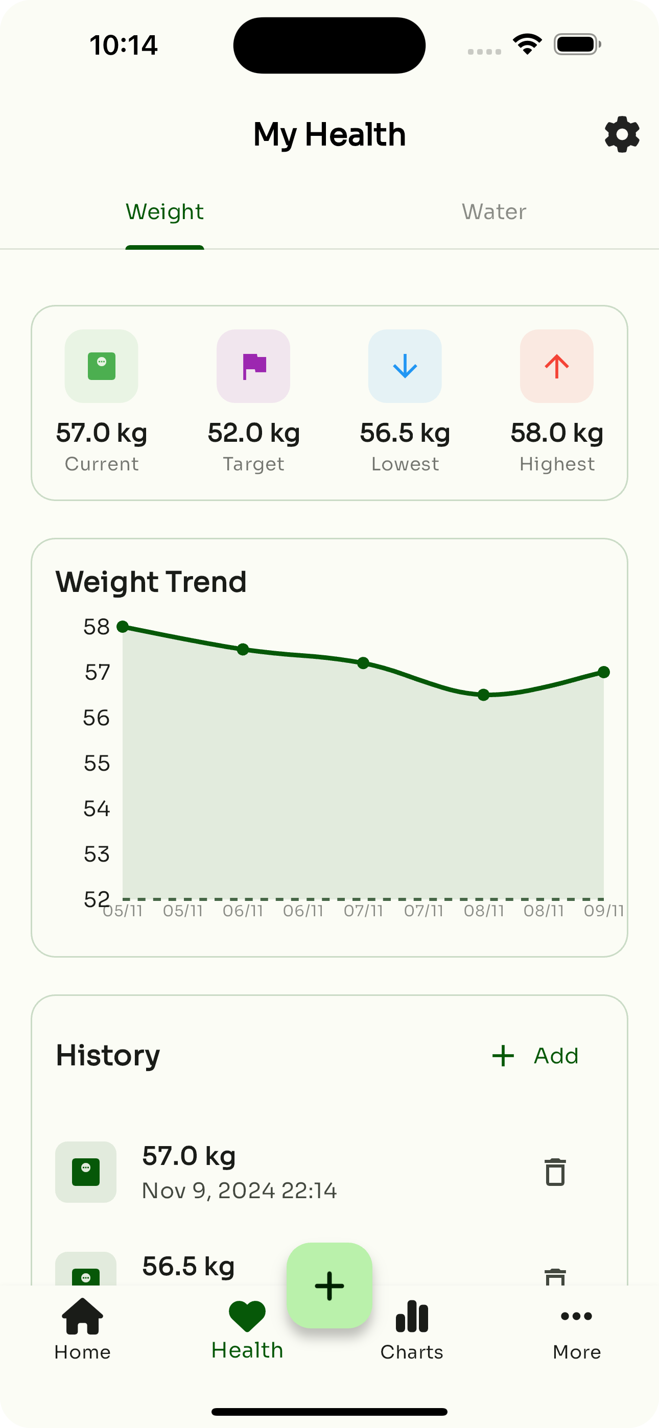 Watch your weight loss journey unfold with clear, easy-to-read charts. See your progress over weeks and months, so you stay motivated even when daily fluctuations try to discourage you.
